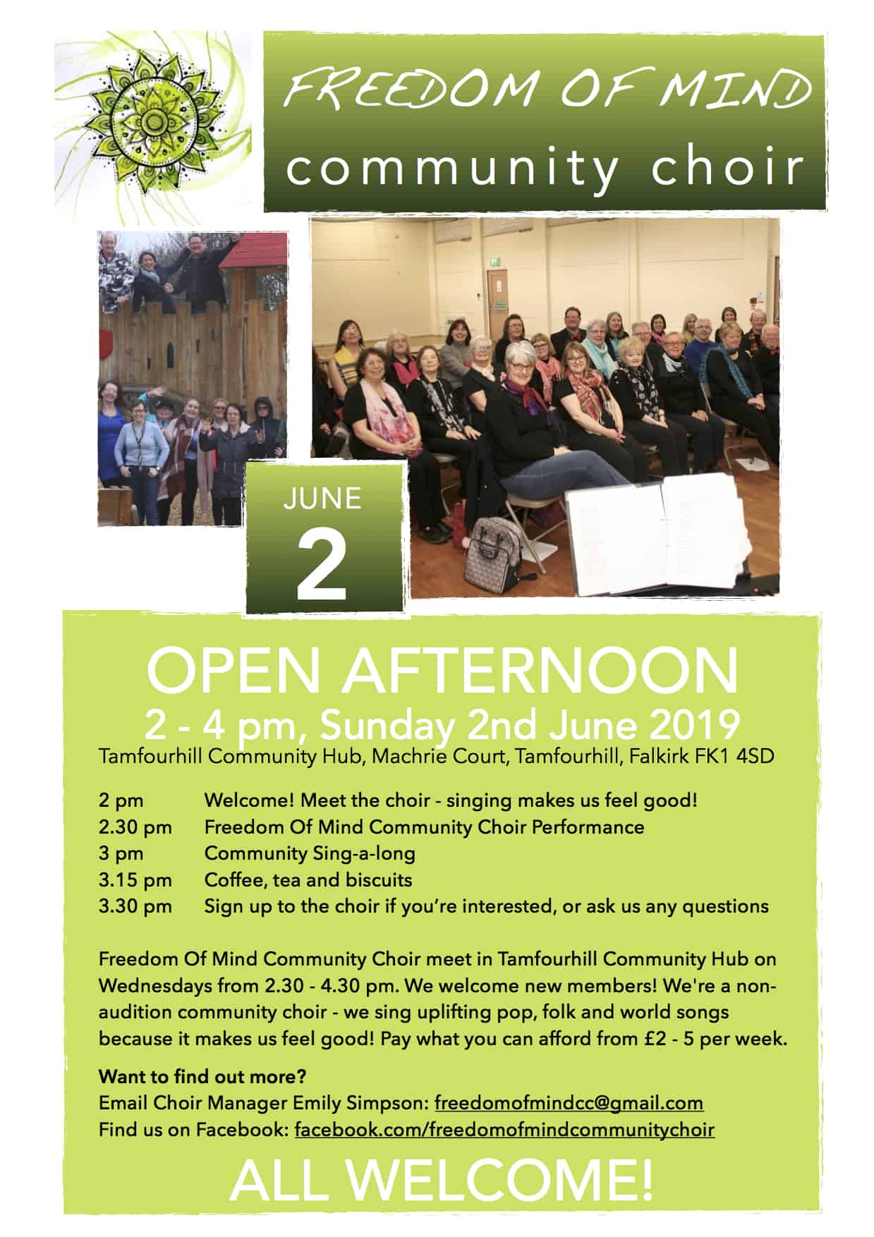 The Freedom of Mind Choir is holding an Open Afternoon on Sunday 2nd June, 2pm – 4pm at the Tamfourhill Community Hall, Cumbrae Drive, Tamfourhill, FK1 4AH, and everyone is welcome.